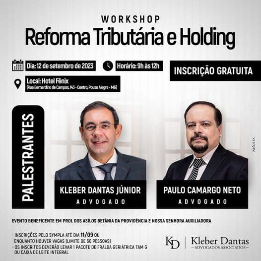O workshop será apresentado pelo advogado empresarial Kleber Dantas Júnior e pelo advogado tributarista Paulo Camargo Neto, que irão compartilhar conhecimentos valiosos e insights estratégicos, visando um planejamento sucessório. Serão abordadas as tendências na legislação tributária, a reforma em tramitação no Congresso e os benefícios oferecidos pelas holdings.