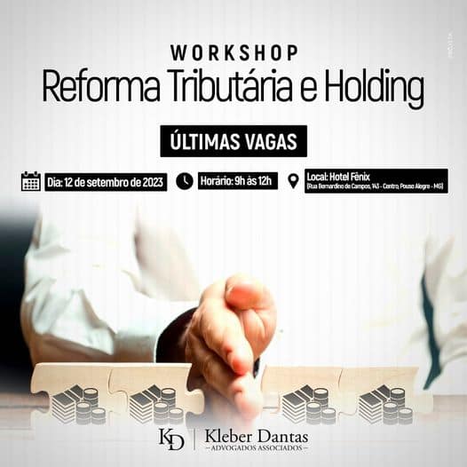 O workshop “Reforma Tributária e Holding” acontece no dia 12 de setembro, às 9h, no Fênix Hotel, em Pouso Alegre/MG.